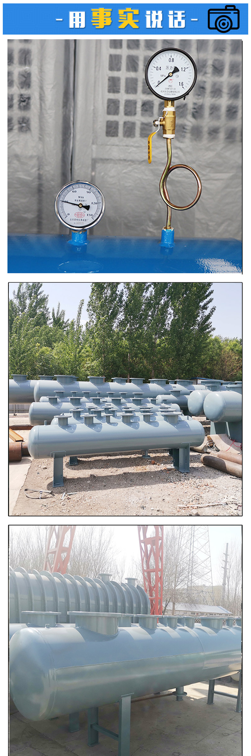 結(jié)構(gòu)由主管、分路支管、排污口、排氣口、壓力表、溫度計等組成。直徑較大的筒體上裝有人孔或手孔,材質(zhì)由碳鋼板卷制,或無縫鋼管制作而成,能承受一定壓力,屬于壓力容器類專業(yè)制造,外表面做防腐或保溫處理。